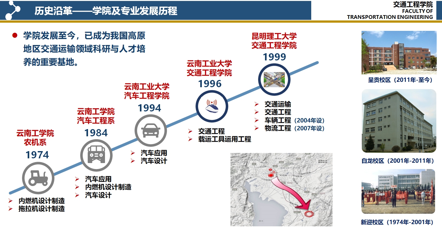 创建于1974年,学院前身为原云南工学院汽车系。学院在新迎校区奠基,在白龙校区成长,在呈贡校区壮大。学院经过40多年的发展,形成了完备的学科体系,拥有交通运输工程一级学科博士和硕士学位授权点、车辆工程二级学科博士和硕士学位授权点、动力机械及工程二级学科硕士学位授权点,同时具备交通运输工程领域工程硕士授权资格。在本科生培养方面,学院现有交通工程、交通运输、物流工程、车辆工程四个本科专业和物流工程(中外合作办学)专业。交通工程专业于2017年通过工程教育专业认证,2019年获批国家级一流本科专业建设;车辆工程专业于2018年通过工程教育专业认证,是教育部首批新工科实践与探索项目专业,2019年获批省级一流本科专业建设;物流工程专业是云南省重点产业引领品牌专业、教育部批准的中外合作办学项目;交通运输专业是云南省本科综合改革试点专业。