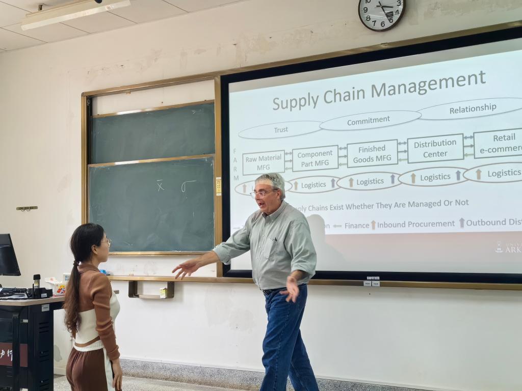 6月5日下午,双方在交通楼A517开展科研合作研讨会,物流工程系主任李杰梅教授代表学院对Kent教授的到访表示热烈欢迎,对阿肯色大学在昆工物流学科建设方面给予的指导表示感谢,并希望双方能长久保持友好、共赢的合作关系。随后,伍景琼副教授向Kent教授介绍了学院的科研平台、主要研究领域以及新文科建设的最新进展,双方共同认识到,基于云南独特的地理优势和在农产品供应链中的重要地位,进一步加强两校在供应链领域的科研合作尤为重要。接着,Kent教授介绍了其所参与的国际科研项目进展情况,为参会人员提供了更广阔的思考视角。此外,双方就物流工程专业中外合作办学项目的实施情况、人才培养模式、当前面临的挑战及未来合作的进一步规划进行了深入讨论。