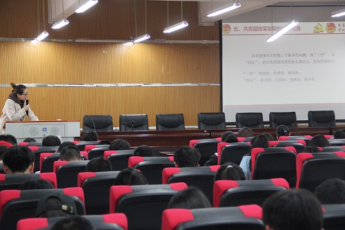 团课以“学习习近平总书记7.2重要讲话精神”为主题。首先引入了中国青年运动的时代主题,即为实现中华民族伟大复兴的中国梦而奋斗。晁洁老师依次从习近平总书记对共青团的高度厚望、三个根本性问题的切实把握、新时代共青团的历史使命、青年一代健康成长的正确道路、共青团改革发展的目标任务、从严治团的全面实施、青年及青团工作的顺利开展深度剖析了共青团团员如何做好党的助手和后备军,严格以社会主义建设者和接班人的标准来要求自己。其中,晁洁老师从政治上、团的干部队伍建设和团员队伍建设三个方面介绍了习近平同志提出的要切实从严治团的要求。政治上要严,坚持以政治建设为统领,加强共青团系统党的建设,增强“四个意识”,坚定“四个自信”,坚决维护党中央权威和集中统一领导,旗帜鲜明抵制各种歪风邪气,保持清风正气和良好形象。团员队伍建设也要严,在团员标准要求上严起来,从把好入团质量关入手,抓好入团以后的教育实践,带动广大青年一起前进。当晁老师谈到如何抓好青年、青团工作时,重点强调了我们需时刻谨记的一点,“抓住的是当下,传承的是根脉,面向的是未来,这攸关党和国家的命运”。