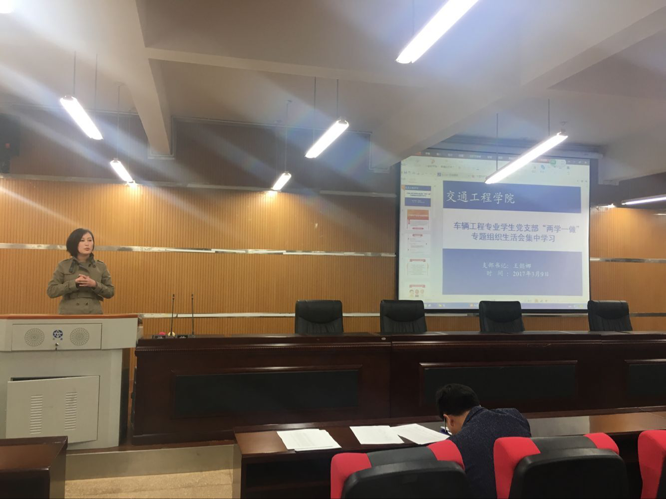 2017年3月9日19:00,我支部在交通楼A座402报告厅开展了“两学一做”专题组织会集中学习。支部书记王懿娜、支部副书记刘晓飞、支部委员吴智刚以及车辆工程42名党员参加了此次集中学习。本次会议应到52人,实到42人,其中9人请假(外出实习8人,病假1人),1人缺席。