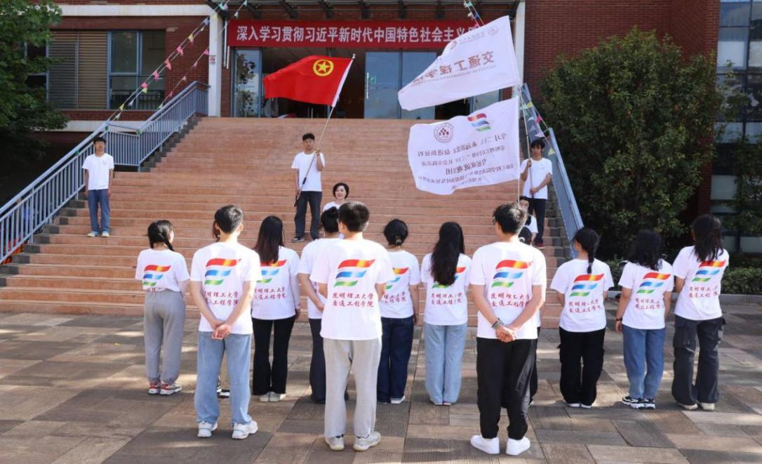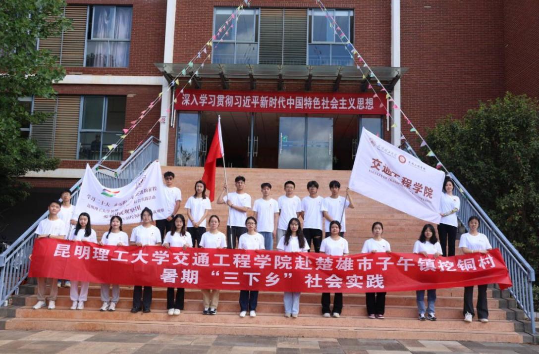 赴楚雄市子午镇挖铜村发展成就观察团在交通楼前举行"民族团结一家亲 交通强国促振兴"2023年暑期"三下乡"社会实践活动出征仪式。院党委副书记王懿娜、团委书记赵云瑶及社会实践团队全体队员参加。