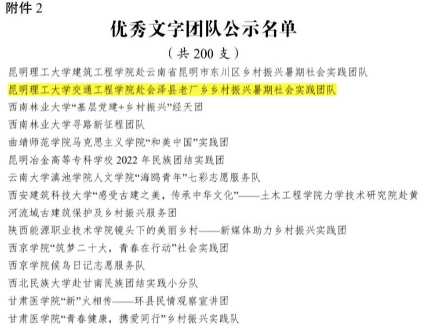 赴会泽县老厂乡乡村振兴暑期社会实践团队荣获“优秀文字团队”荣誉。