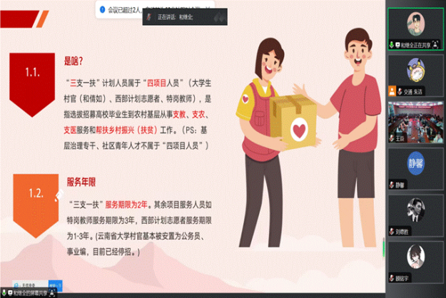 分享会上,2022 届毕业生和继全结合自身工作经历,详细解读了 “三支一扶”“西部计划” 等基层就业项目的政策背景与现实意义,同时分享了应聘过程中的技巧,为同学们提供了实用的指导。