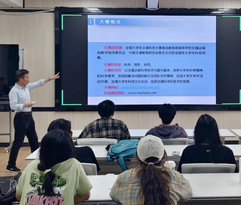 随后,贾现广老师结合自身多年指导学生参加“全国大学生交通运输科技大赛”的丰富经验,向同学们详细解读了比赛赛制,并通过典型案例分析向同学们展示了优秀作品的创新要素和评审要点,带领同学们共同深入剖析了选题策略、方案设计,材料撰写等关键环节的注意事项,为同学们提供了可操作的备赛指南。