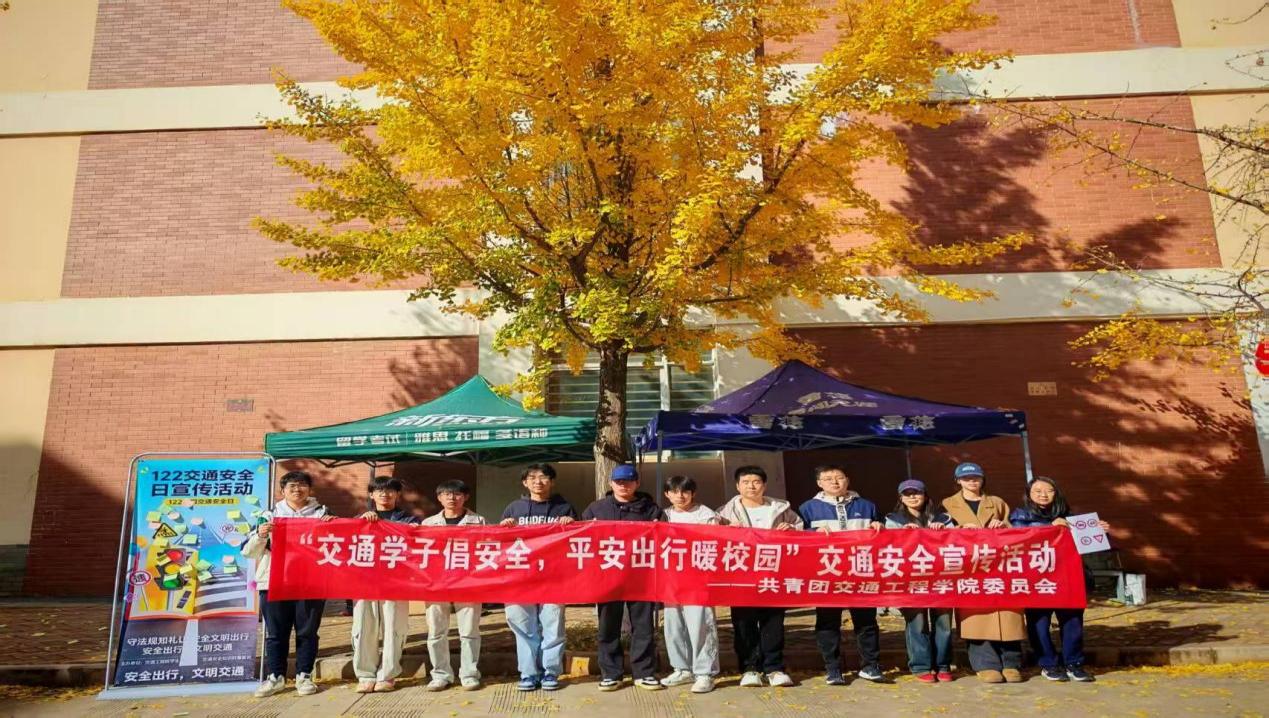 活动的最后组织了全体工作人员合影,银杏叶铺满活动场地,红幅衬着暖阳,大家满心是为同学们科普知识的喜悦,脸上都洋溢着笑容。这场活动让安全意识漫入校园烟火,以沉浸式互动传递交通安全知识,既响应了国家号召、践行了专业使命,也填补了同学们的认知空白,为构建平安校园凝聚了青春力量。