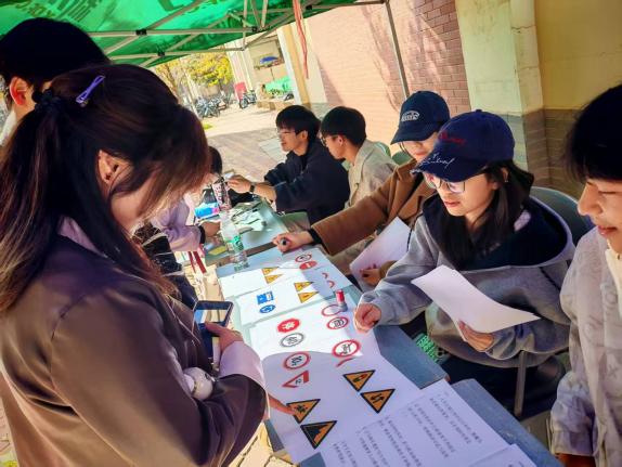 宣传活动由多个趣味小游戏组成,提高了大家的参与积极性。同学们来到活动现场参与知识科普小游戏,在游戏过程中了解了许多交通安全知识。桌案上摆满各种类型的交通标识,同学们围聚辨认、相互探讨,工作人员为大家解释着被认错的标志。笑声与讲解声交织,指尖起落间大家厘清了标识深意。